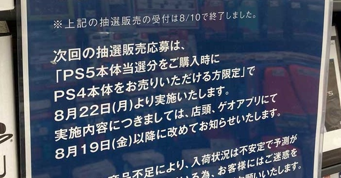 PS4を下取りに出すみたいな形を採らざるを得ない状況なのも仕方ないと捉えるか、そんな条件ばかりで納得がいかないと不満を言うか・・・いずれにしても供給不足なのが原因です。